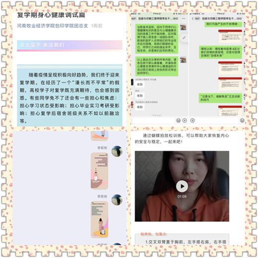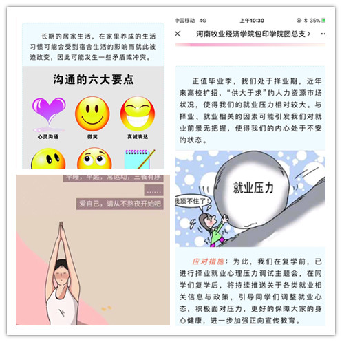 在员工居家学习阶段至复学归来,充分利用学校官网、微信公众号等新媒体平台,通过图文、视频、线上主题会等形式,围绕疫情居家心理调试、毕业季就业压力缓解、复学归来阶段的心理适应策略等帮助缓解员工的焦虑心理。